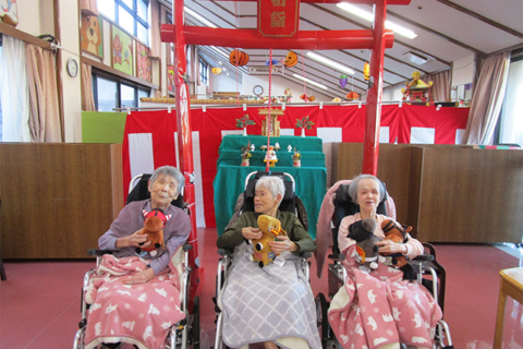 ■初詣施設内に鳥居を設置し、初詣を行いました。皆さん熱心に手を合わせられ、職員扮...