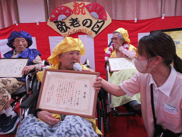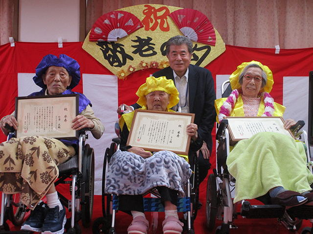今年は18名の方が喜寿・卒寿・傘寿・米寿を迎えられ、3名の方が代表としてステージに上がりました。