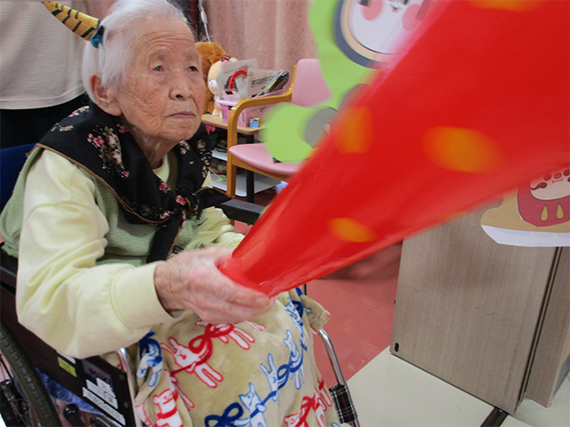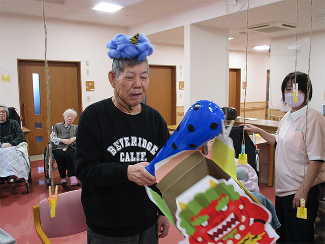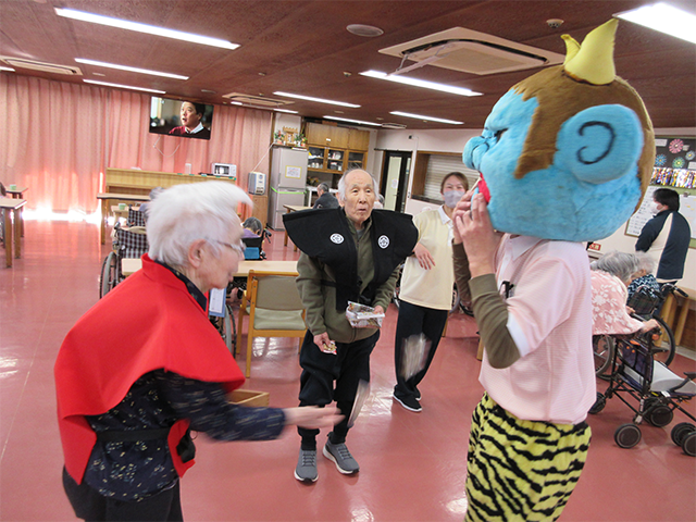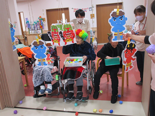 節分の会では、豆まきと、鬼倒しのゲームを行いました。