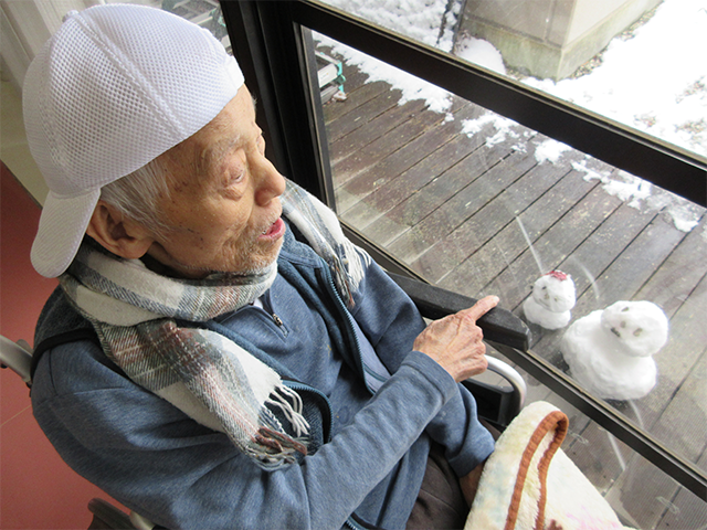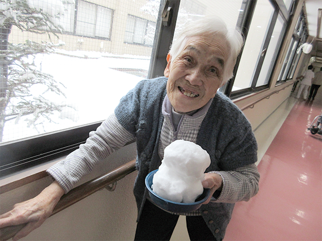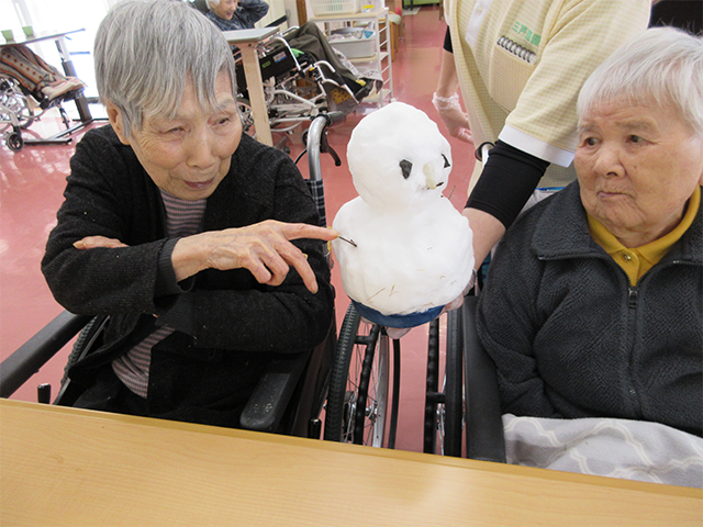 小さな雪だるまを作り持って行くと「冷たい!」と言いながらも皆さん興味津々で触っていました。