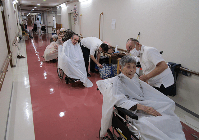 ■散髪毎月第4月曜日散髪を行っています。カットだけではなく、顔剃りや眉毛を整えてもらい、終了後は皆さん素敵な表情をされています。 ...